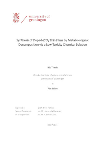 Witte, Pim (2021) Synthesis of Doped-ZrO2 Thin Films by Metallo-organic Decomposition via a Low-Toxicity Chemical Solution. Bachelor's Thesis, Chemistry.