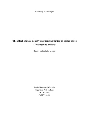 Noorman, Femke (2024) The effect of male density on guarding timing in spider mites (Tetranychus urticae). Bachelor's Research Project (period 2a), Biology.