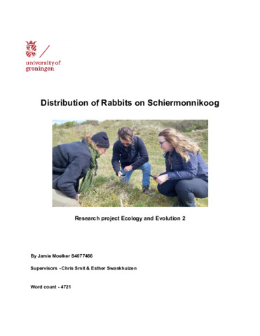 Due to two diseases, Rabbit Haemorrhagic Disease (RHD) and Myxomatosis, the rabbit population in the Netherlands has been severely impacted. This has resulted in the Wild Rabbit becoming a red list species (threatened species). Wild rabbits play an important role in the ecosystems they inhabit, often being regarded as ecosystem engineers. On the island of Schiermonnikoog (an island, in the Dutch Wadden sea) the wild rabbit have taken to the dunes, regulating the expansion seaberries and hawthorns. The rabbit population on Schiermonnikoog (Schier) has also been struggling to recover since the outbreaks of RHD and Myxomatosis. Invasive feral cats on the island have not aided their recovery, often preying on the young and weak. To observe whether the rabbit population on Schier is recovering or not, we will be conducting various sampling methods used to approximate the rabbit abundance and observe their distribution on the island. These sampling methods consist of; rabbit pellet counts (RPC’s), Mapping, Transects, Thermal imaging observations and wildlife camera observations.