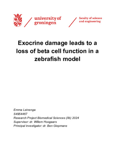 Leinenga, Emma (2024) Exocrine damage leads to a loss of beta cell function in a zebrafish model. Bachelor's Research Project (period 2b), Biology.
