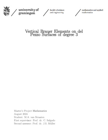 Straaten, M.A. van (2024) Vertical Brauer Elements on del Pezzo Surfaces of degree 3. Master's Thesis / Essay, Mathematics.