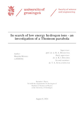Mosiej, Matylda (2024) In search of low energy hydrogen ions - an investigation of a Thomson parabola. Bachelor's Thesis, Physics.