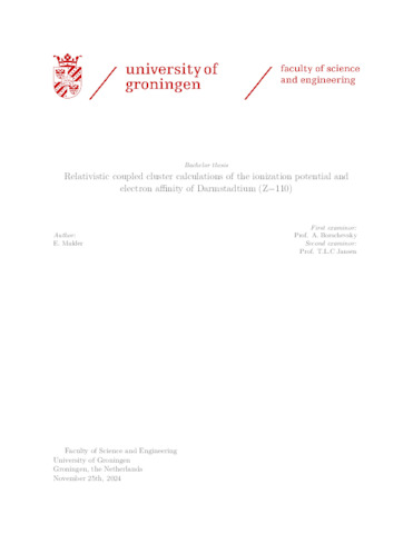 Mulder, Eke (2024) Relativistic coupled cluster calculations of the ionization potential and electron affinity of Darmstadtium (Z=110). Bachelor's Thesis, Life Science and Technology.