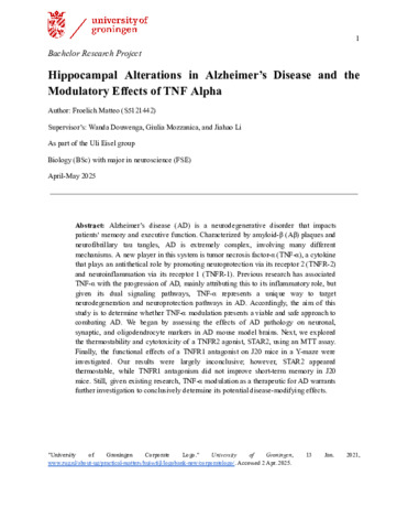 Froelich, Matteo (2025) Hippocampal Alterations in Alzheimer’s Disease and the Modulatory Effects of TNF Alpha. Bachelor's Research Project (period 2b), Biology.