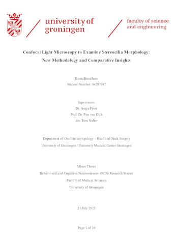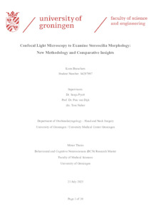 Busschers, Koen (2025) Confocal Light Microscopy to Examine Stereocilia Morphology: New Methodology and Comparative Insights. Research Project 1 (minor thesis), Behavioural and Cognitive Neurosciences.