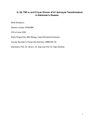 Munteanu, Mihai (2025) IL-1β, TNF-α, and C1q as Drivers of A1 Astrocyte Transformation in Alzheimer’s Disease. Bachelor's Thesis, Biology.